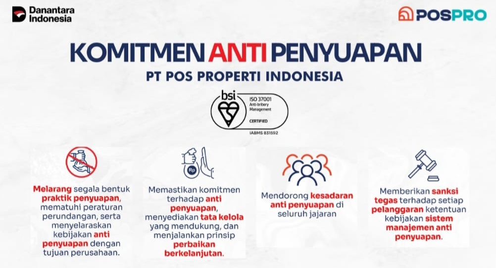 Sebagai bukti konkret, PT Pos Properti Indonesia telah berhasil memperoleh sertifikasi ISO 37001:2016 terkait Sistem Manajemen Anti Penyuapan (SMAP).